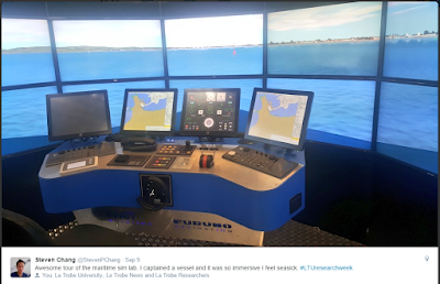 | Steven Chang’s tweeted image of the maritime simulation lab from the research facility tour. |