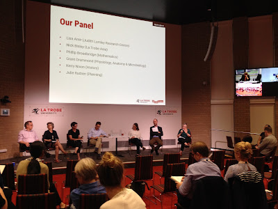 Thankfully, we had assembled a panel of experts form across the University and representing scholars at various career stages, from graduate researcher to full professor. A/Prof Jill Murray (Law) was our host, deftly weaving a conversation between (in alphabetical order) Lisa Amir (Judith Lumley Research Centre), Nick Bisley (la Trobe Asia), Philip Broadbridge (Mathematics), Grant Drummond (Physiology, Anatomy and Microbiology), Kerry Nixon (History) and Julie Rudner (Planning), as well as researchers in the audience of around seventy.