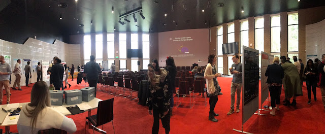 Break time! Panoramic shot of the conference venue, the John Scott Meeting House Chamber, lined with posters, and participants buzzing after some great talks. Photo by Ella Johnston (on Twitter).