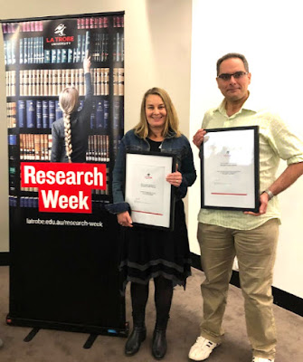 | Inaugural Take 5 winners: Sallie Yea (L) from HuSS and Seb Dworkin from PAM. Photo from La Trobe University. |