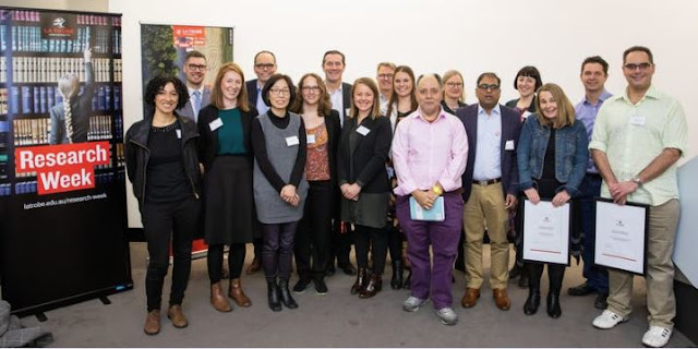 | Competitors from the inaugural Take 5: Research Rumble event during Research Week, Sept 2019. Photo from La Trobe University. |