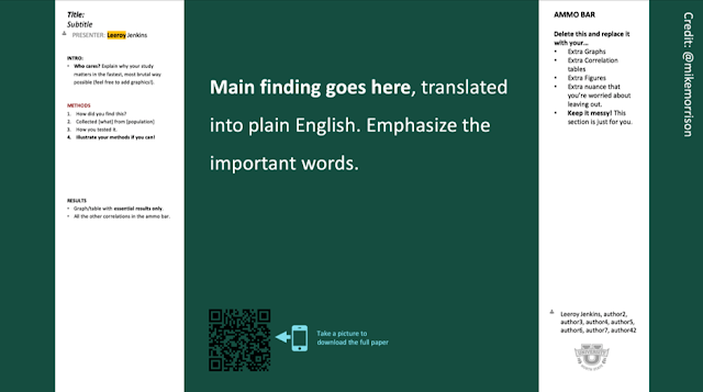 The key to Mike’s poster is that it doesn’t attempt to present a comprehensive picture of the research project. Rather, the intent is to start a conversation between the researcher and the viewer by presenting a single succinct key finding in the centre of the poster. This key finding can be seen from across the room. It is a short sentence in plain English using bold characters to highlight the important words. Additional information is put in the two side columns. Additional information about the project can be accessed via a website (you can even link it to a Dropbox file that includes the associated research paper) using a QR-code as the trigger.