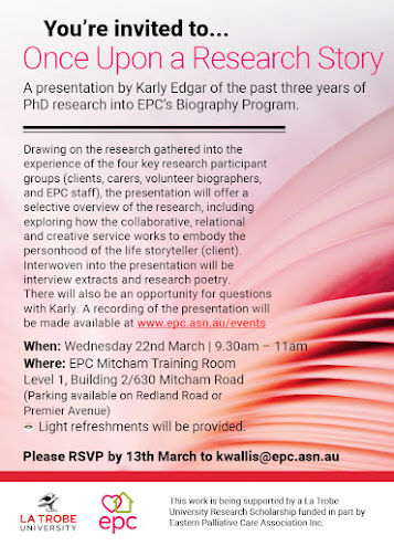 I have been researching the Biography Program that Eastern Palliative Care Association Inc. (EPC) offers as part of their volunteer services. EPC provides specialist care to palliative patients in their homes, and any patients can participate in the Biography Program. If they do, a volunteer will visit them in their home, or meet with them online/over the phone if they prefer, and record them telling life stories. The volunteer then transcribes their stories and works with them to produce a written life story.